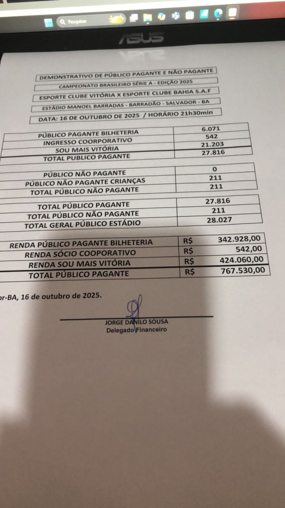 A renda de R$ 767.530,00 foi dividida em R$ 342.928,00 pagantes da bilheteria, junto a R$ 542,00 dos pagantes corporativos e R$ 424.060 dos sócios do Sou Mais Vitória.